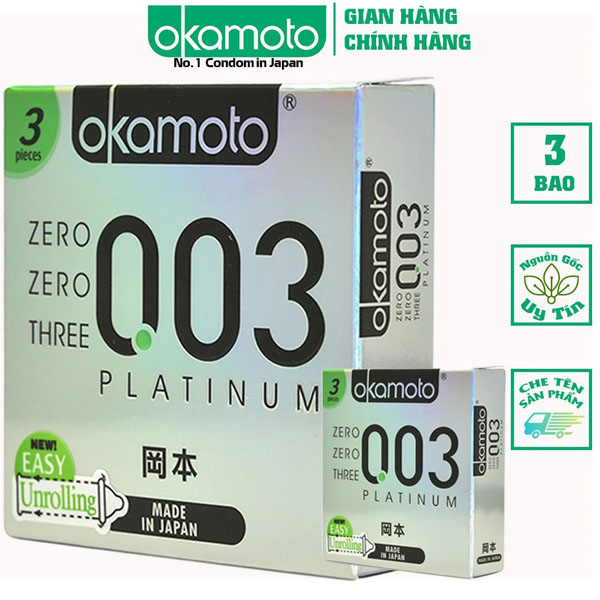 Bao cao su Okamoto zero zero three 0.03 Platinum là bao cao su cao cấp của hãng Okamoto (Nhật Bản). Thiết kế siêu mỏng mang lại cảm giác chân thật nhất cho quý ông. Ngoài ra, sản phẩm còn chứa thêm chất bôi trơn gốc nước cao cấp giúp việc quan hệ trở nên dễ dàng hơn.